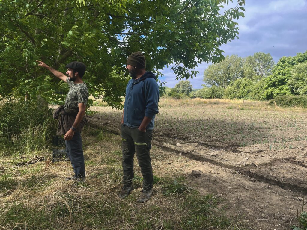 Víctor nos resulta peculiar, con su boina marrón y sus formas de hablar: “continuar en el pueblo pudiendo vivir de algo relacionado con la tierra”, simple, pero con peso. Con esta idea en la cabeza y la valentía de emprender empezaron hace poco una ganadería equina de yeguas hispano-bretonas para potros de carne: “Yeguas entre robles”. Unos animales preciosos, usados históricamente para tiro. Las yeguas que hemos podido contemplar con los potros viven en grandes áreas delimitadas del bosque público. Isa, Román, Víctor y Gabriele mueven sus yeguas por distintas zonas del monte para dejar los pastos descansar y favorecer la fertilidad gracias a las rotaciones. Además, este monte es aprovechado por otras explotaciones ganaderas como ovino y vacuno.