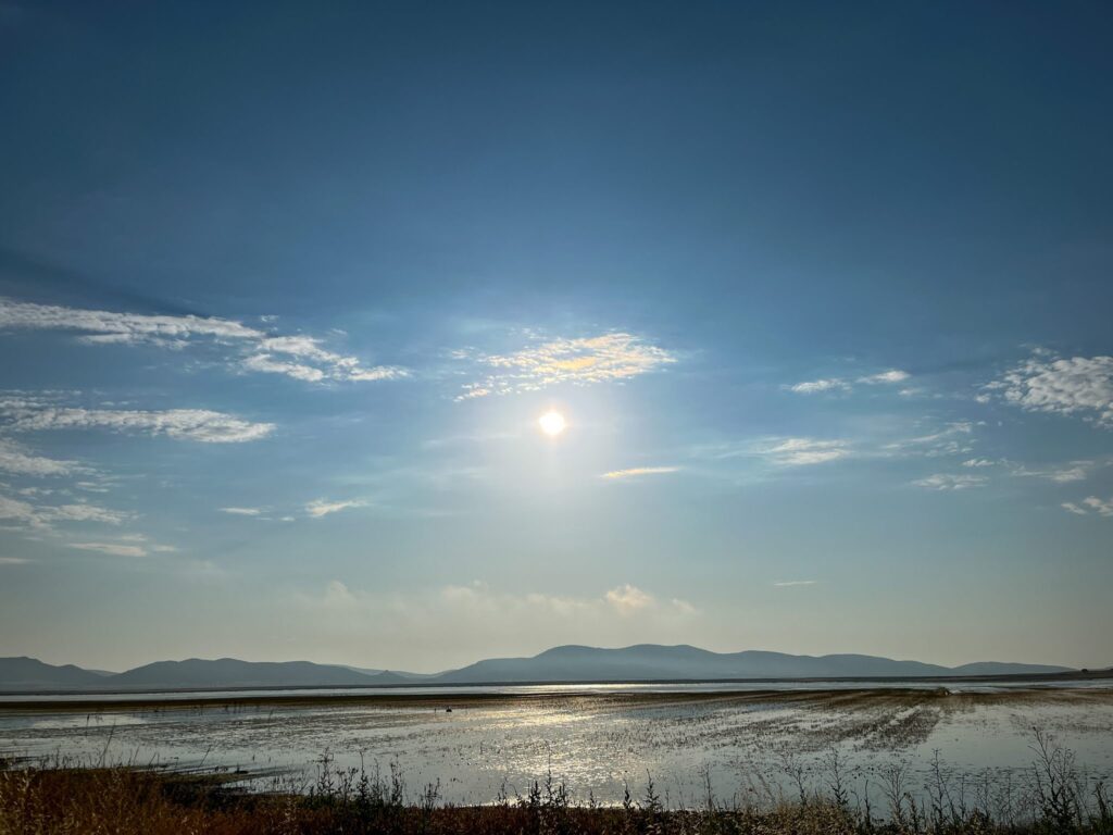 ¡Qué buen día! Siento el viento de la bajada en la cara y algo me hace sonreír. Es como si las mariposas que se nos cruzan en el camino nos rociaran con endorfinas. Estoy feliz y me siento polinizadora también en este viaje peculiar y picaflor por el medio rural. El último tramo hasta Gallocanta ha sido rodeando la laguna salada que también lleva este nombre, una llanura de agua enorme y preciosa que ha vuelto a transformar el paisaje que veníamos disfrutando los días anteriores y que ha aparecido como un espejismo plateado ante nuestros ojos,