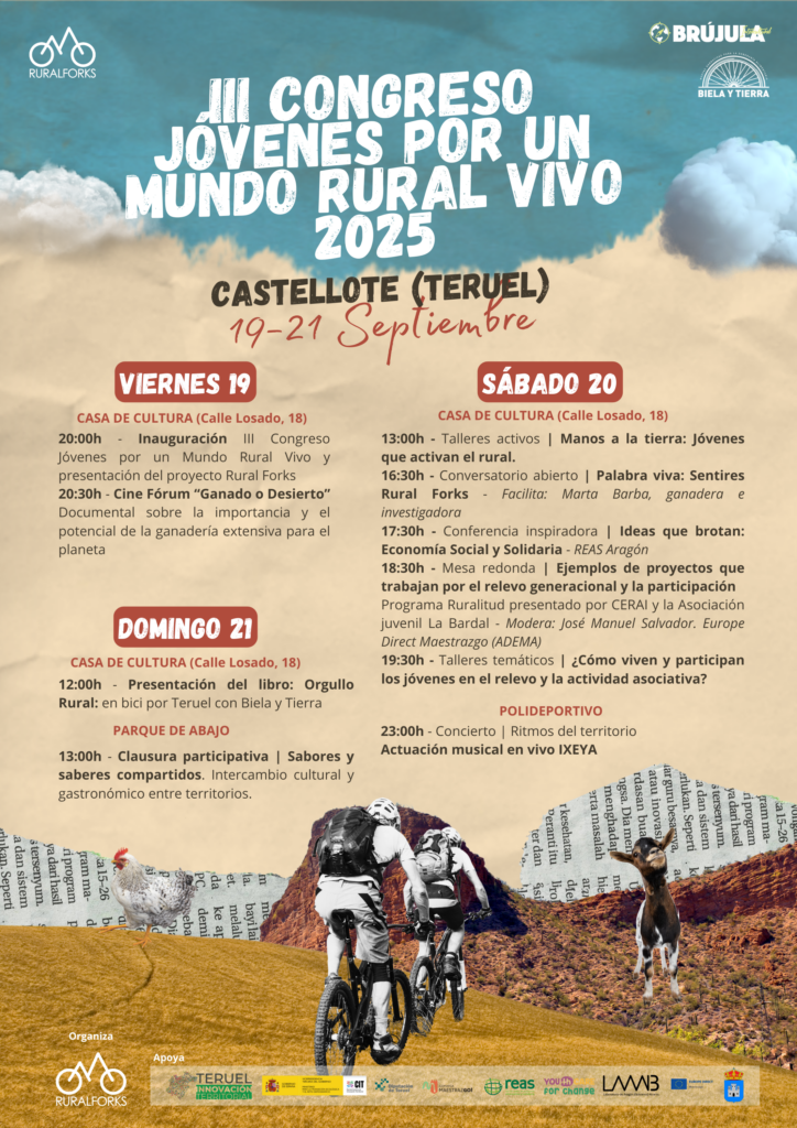 El III Congreso Jóvenes por un Mundo Rural Vivo será tanto el cierre de la tercera edición de Rural Forks como un espacio cultural y participativo abierto a toda la comunidad. Castellote se llenará de jóvenes, experiencias y propuestas que miran hacia el futuro del medio rural con compromiso y esperanza.
